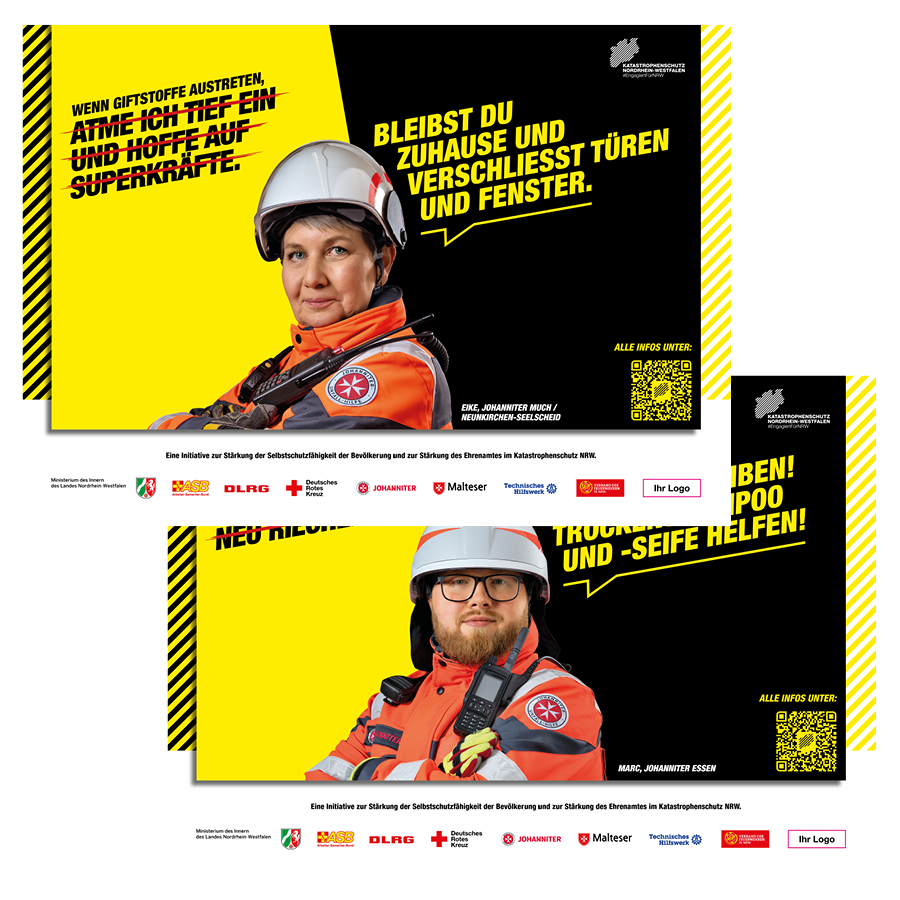 Wenn Ihr euren Verband oder eure Ortsgruppe auf den unübersehbaren Großflächen-Versionen der Befähigungsmotive verewigen wollt, seid ihr hier genau richtig. In dieser Version findet ihr die anpassbaren Druckdaten mit Eike und Marc-André, unseren Kampagnengesichtern von der JUH.