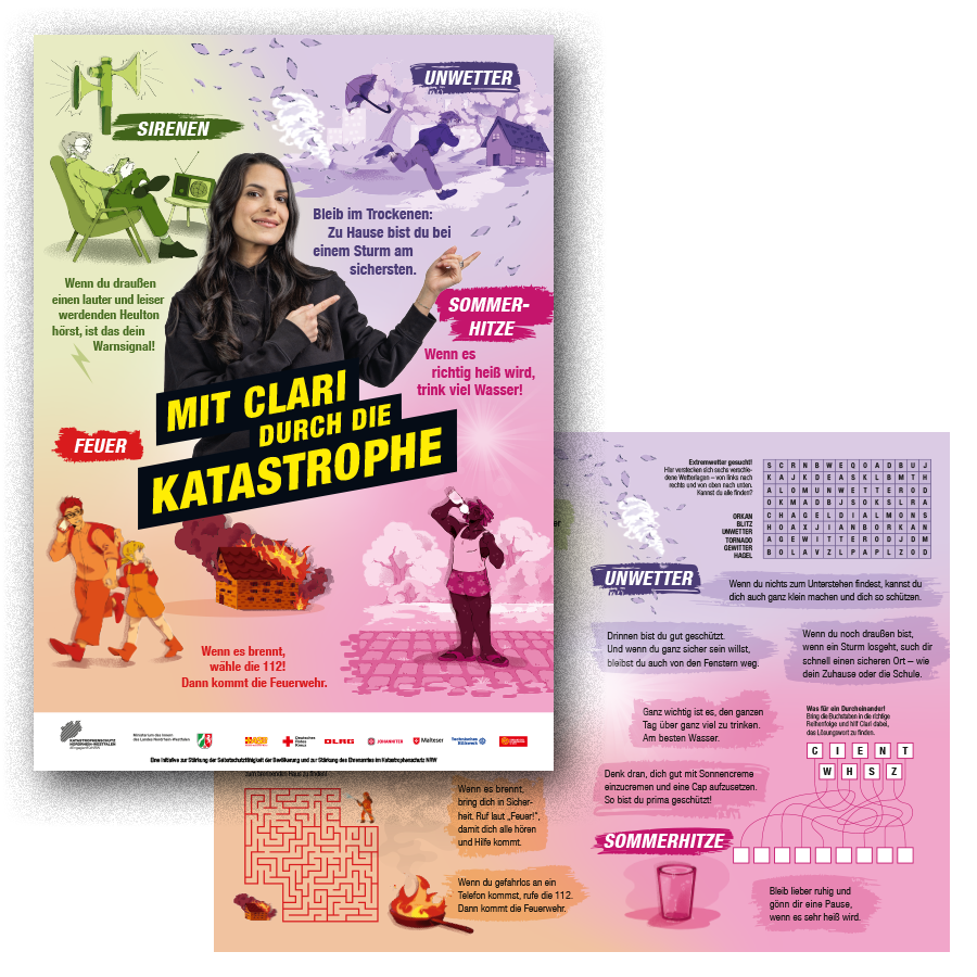 Auch im Katastrophenschutz gilt die Devise: Früh übt sich! Mit dem Kinderposter „Mit Clari durch die Katastrophe“ können sich auch die Kleinen schon mit unterschiedlichen Selbstbefähigungstipps befassen. Mit Rätseln, einfachen Ratschlägen und natürlich Clari werden sie auf motivierende Weise an das Thema herangeführt und lernen schon früh, worauf sie achten müssen und können.